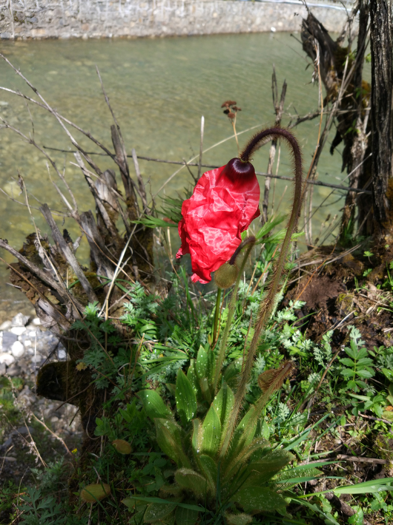 形態(tài)學(xué)特征:多年生草本,高30-75厘米,基部蓋以宿存的葉基,其上密被淡黃色或棕褐色、具多短分枝的剛毛。須根纖維狀。葉全部基生,蓮座狀,葉片倒披針形或狹倒卵形,長3-18厘米,寬1-4厘米,先端急尖,基部漸狹,下延人葉柄,邊緣全緣,兩面密被淡黃色或棕褐色、具多短分枝的剛毛,明顯具數(shù)條縱脈;葉柄長6-34厘米,基部略擴大成鞘。花葶1-6,從蓮座葉叢中生出,通常具肋,被棕黃色、具分枝且反折的剛毛。花單生于基生花葶上,下垂;花芽卵形;萼片卵形,長1.5-4厘米,外面密被淡黃色或棕褐色、具分枝的剛毛;花瓣4,有時6,橢圓形,長3-10厘米,寬1.5-5厘米,先端急尖或圓,深紅色;花絲條形,長1-3厘米,寬2-2.5毫米,扁平,粉紅色,花藥長圓形,長3-4毫米,黃色;子房寬長圓形或卵形,長1-3厘米,密被淡黃色、具分枝的剛毛,花柱極短,柱頭4-6圓裂。蒴果橢圓狀長圓形,長1.8-2.5厘米,粗1-1.3厘米,無毛或密被淡黃色、具分枝的剛毛,4-6瓣自頂端微裂。種子密具乳突。