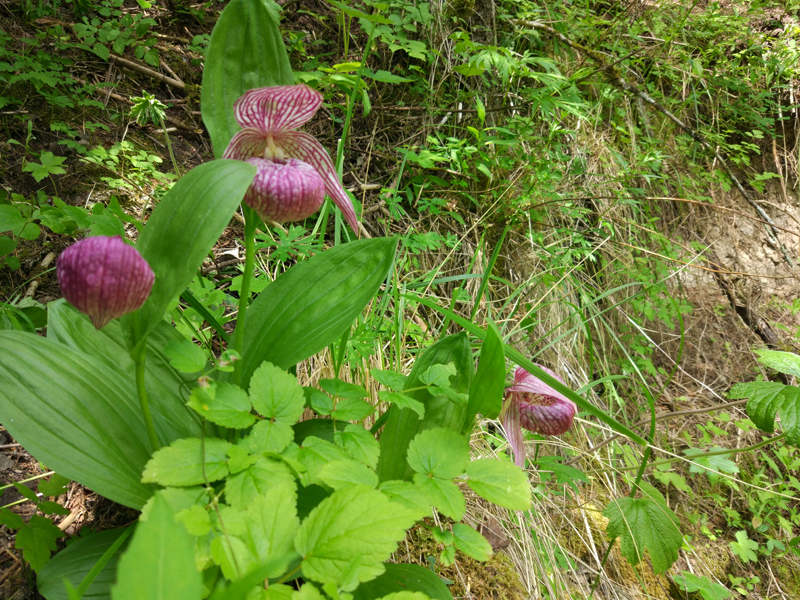 形態(tài)學(xué)特征:植株高15-35厘米,具粗壯、較短的根狀莖。莖直立,無毛或上部近節(jié)處被短柔 毛,基部具數(shù)枚鞘,鞘上方通常具3枚葉,罕有2或4枚葉。葉片橢圓形、卵狀橢圓形 或?qū)挋E圓形,長8-16厘米,寬3-9厘米,先端急尖、漸尖或鈍,無毛或疏被微柔毛,邊緣具細(xì)緣毛。花序頂生,具1花;花苞片葉狀,橢圓形至卵狀披針形,長6-11厘 米,寬2-5厘米,先端急尖或漸尖;花梗和子房長2-3厘米,無毛或上部偶見短柔 毛;花大,俯垂,紫色、紫紅色或暗栗色,通常有淡綠黃色的斑紋,花瓣上的紋理尤其 清晰,唇瓣的囊口周圍有白色或淺色的圈;中萼片橢圓形或卵狀橢圓形,長3-6厘米,寬2.5-4厘米,先端漸尖、急尖或具短尖頭,背面無毛或偶見疏微柔毛,邊緣多少具 細(xì)緣毛;合萼片與中萼片相似,但略短而狹,先端2淺裂;花瓣披針形或長圓狀披針 形,長3.5-6.5厘米,寬1.5-2.5厘米,先端漸尖或急尖,內(nèi)表面基部密生短柔毛,邊緣疏生細(xì)緣毛;唇瓣深囊狀,近球形至橢圓形,長3.5-6厘米,寬亦相近或略窄,外表面常皺縮,后期尤其明顯,囊底有長毛;退化雄蕊卵狀長圓形,長1.5-2厘米,寬8-12毫米,背面多少有龍骨狀突起,基部近無柄。
