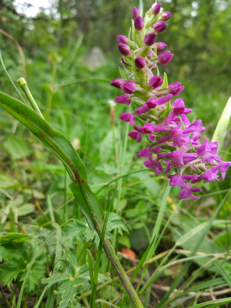 形態學特征:植株高17-35厘米。塊莖卵狀橢圓形,長1-3厘米,肉質,下部掌狀分裂,裂片 細長。莖直立,較粗壯,圓柱形,基部具2-3枚筒狀鞘,其上具3-5枚葉,上部具1 至數枚苞片狀小葉。葉片橢圓形或橢圓狀長圓形,長4-16厘米,寬(2.5-)3-4.5厘米,先端鈍或急尖,基部收狹成抱莖的鞘。總狀花序具多數密生的花,圓柱形,長4-14厘米;花苞片披針形,直立伸展,先端漸尖,不成尾狀,最下部的明顯艮丁花;子房紡錘形,頂部稍弧曲,連花梗長7-8毫米;花紫紅色或粉紅色,極罕為帶白色;中萼片直立,卵形,長3-5毫米,寬2-3.5毫米,先端鈍,具3脈;側萼片反折,斜卵形,較中萼片稍長和寬,邊緣向外卷,先端鈍,具3脈,前面1條脈常具支脈;花瓣直立,斜寬卵狀三角形,與中萼片等長且較寬,較側萼片稍狹,邊緣具波狀齒,先端鈍,具3脈,前而的1條脈常具支脈;唇瓣向前伸展,寬倒卵形,長3-5毫米,前部3裂,中裂片較側裂片稍大或等大,三角形,先端鈍或稍尖;距細而長,狹圓筒形,下垂,長7-10毫米. 稍向前彎,向末端略增粗或稍漸狹,通常長于子房或等長;花粉團卵球形,具細長的柄和粘盤,粘盤披針形。
