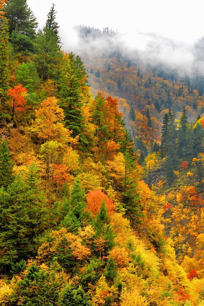 這里的秋,給整片大地披上了色彩斑斕的外衣,無論是崇山峻嶺中,還是峰巒疊翠下,都覆蓋著一層絢麗的顏色。