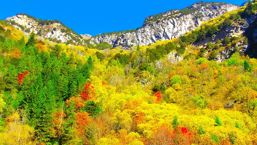 黑水縣位于川西北阿壩藏族羌族自治州中部,屬季風高原型氣候,旱、雨季分明,日照充足,氣溫年差較小,日差較大,并隨海拔高度不同差別較大,造就境內豐富的生態資源和極高的森林覆蓋率和眾多自然風光。特別在秋天——黑水的秋天向來是五顏六色的,每年9月至11月,秋風掃過,滿山斑斕、層林盡染、如火如荼、恍如仙境。大片的彩林像是畫家打翻的調色板,漫山繽紛如臨風飄蕩的畫卷,堆紅疊翠的山坡如錦緞玉帛,色彩眩目讓人心醉,吸引著眾多游客和攝影愛好者前來觀賞。黑水彩林主要由奶子溝、達古冰山、三奧雪山、卡龍溝、紅軍大峽谷“五溝”彩林組成,長達八十里,總面積近3000平方公里。
