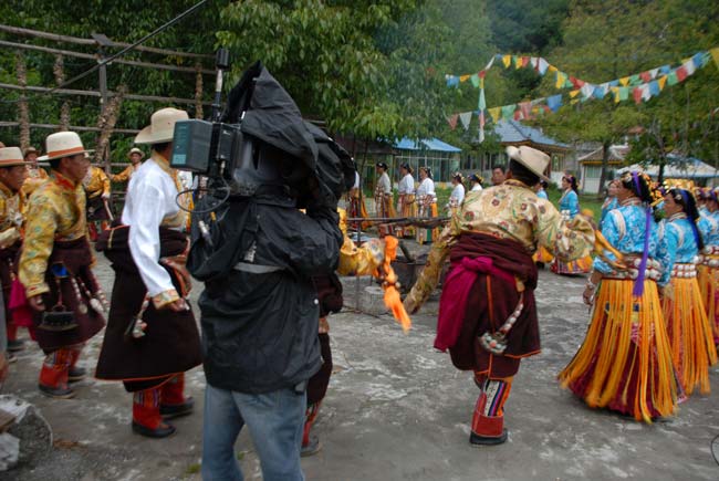 在藏風(fēng)情濃郁的谷汝村,當(dāng)?shù)卮迕裆碇鴺O具特色的民族服飾,圍著篝火跳著歡快的鍋莊,享受著團(tuán)圓的中秋夜。