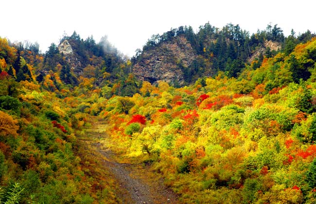 奶子溝彩林洋洋灑灑長達八十里,蔚為壯觀。樹種主要由樺樹、松樹、柏樹、楓樹和各種喬木組成,還有不同色彩的針葉林、闊葉林、次生林、灌木叢點綴其間,密密麻麻地覆蓋了一坡又一坡。在純凈的藍天底下,紫紅、粉紅、橘紅、金紅、深黃、草綠、黃綠、棕紅、褐色的樹木形成了“萬類霜天競自由”之勢。進入彩林世界你會感覺進了油彩的世界,任你語言學家、色彩學家在它面前都會感到詞匯的匱乏,色彩的蒼白。