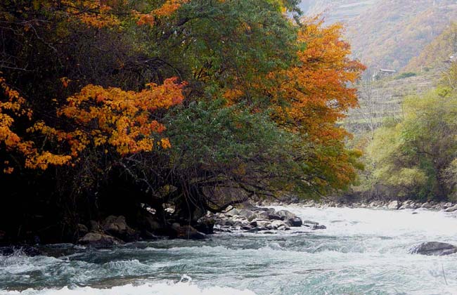 達(dá)古冰山景區(qū)彩林區(qū)森林覆蓋良好,植物資源豐富,各種植物的分布呈現(xiàn)出有規(guī)律的垂直分布,闊葉林、次生林、灌木叢遍及山谷。每年金秋時節(jié),花楸、江樺、鵝掌秋、三麻柳、落葉松等變色植物受氣候、地形、地貌等諸多氣候的影響展現(xiàn)出奇特的美景,這些植物的樹葉在秋風(fēng)的吹拂下,由不同程度的綠變成赤、橙、黃、紅、灰、褐等顏色。數(shù)百米的紅樺林里薄而紅的樺樹皮記載著達(dá)古的歷史;成片成片的金黃色讓你一眼就能記住落葉松的存在;花楸的枝葉或紅或黃在秋風(fēng)里搖曳;還有黃櫨葉那淡淡的紫零星的點(diǎn)綴其間……、幾十里的山谷被五彩紛呈的色彩有章有法的描摹到了極致。你一定會感嘆這里的彩林色彩會如此的豐富,曾有名風(fēng)景名勝專家錢振越這樣的高度贊譽(yù):“我在全國各地找紅葉,終于在黑水找到了。這里的紅葉面積之大、色彩之豐富,堪稱世界之最。”