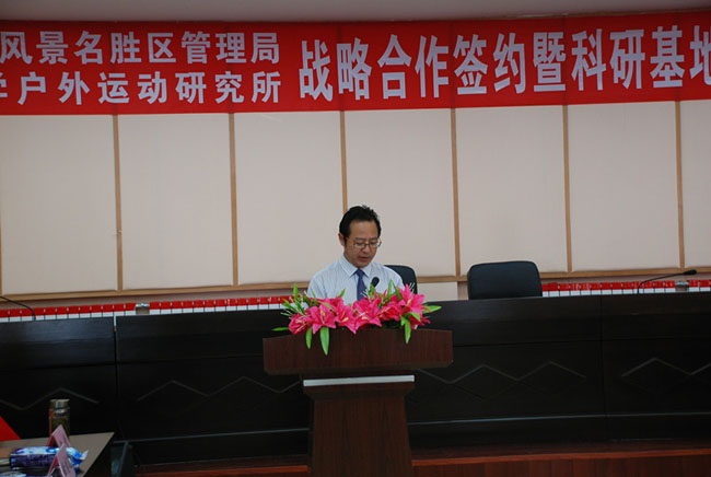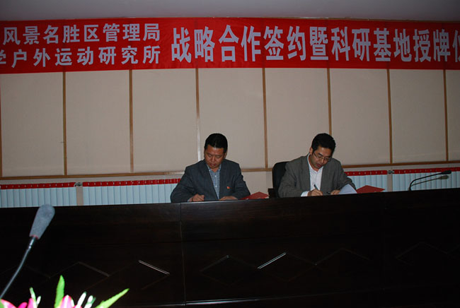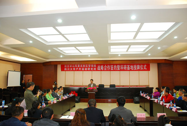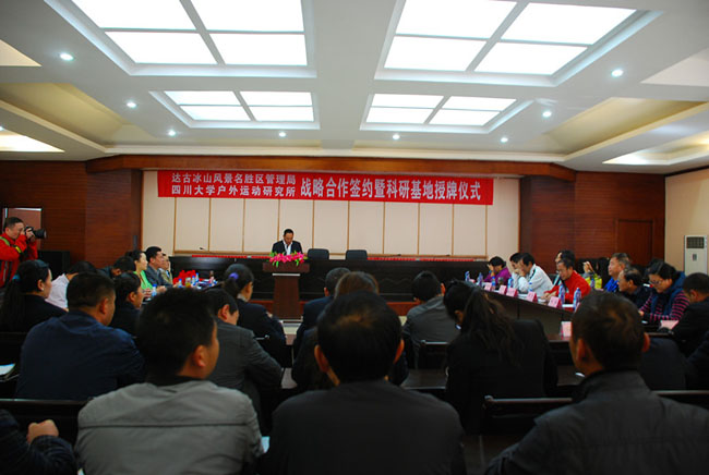 ? ? ? ? 6月2日,在達(dá)古冰山管理局、四川大學(xué)、黑水縣委縣政府相關(guān)領(lǐng)導(dǎo)和數(shù)十位省內(nèi)外運(yùn)動(dòng)旅游、戶(hù)外健康領(lǐng)域?qū)<夜餐?jiàn)證下,達(dá)古冰山風(fēng)景名勝區(qū)——四川大學(xué)戶(hù)外運(yùn)動(dòng)研究所戰(zhàn)略合作簽約暨科研基地掛牌儀式在達(dá)古冰山隆重舉行。四川大學(xué)社科處處長(zhǎng)姚樂(lè)野為達(dá)古冰山戶(hù)外運(yùn)動(dòng)研究基地授牌,達(dá)古冰山管理局局長(zhǎng)周全福和四川大學(xué)戶(hù)外運(yùn)動(dòng)研究所所長(zhǎng)韓海軍分別代表雙方簽署了戰(zhàn)略合作協(xié)議。