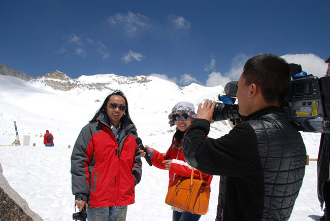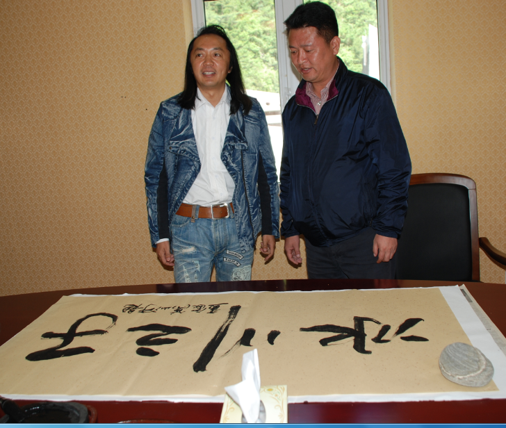 達古冰山景區優美的冰川自然風光、獨特的民俗文化讓萬山河情不自禁的感慨道:“達古冰山景區山靈俊秀,林木蔥郁,讓我有一種置身世外桃源的感覺。”在海拔4860米的一號冰川觀景臺上,仰望壯美宏大的達古冰川,萬山河難掩心中的激動說道:“今天有幸來到達古冰山景區,天公作美,讓我看到了他最原始,最壯美的一面,這給了我很多的創作靈感,我要用我最好的作品來展示他。”萬山河并在冰山之巔現場揮毫為達古冰山景區題詞“情系達古冰川魂凝天地”,其書法風貌獨特,書法氣勢壯闊,氣韻清遠震撼力十足。