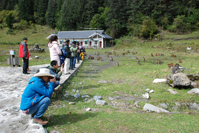 每年冬春兩季,達古冰山的藏酋猴都會下山,并在金猴海附近停留約五個月,此情此景,構成了景區一道亮麗的風景線。
