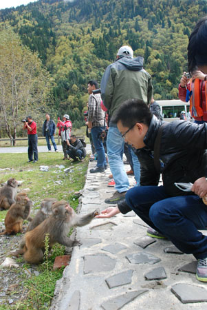 10月1日,國慶長假第一天,達古冰山景區天氣晴朗,游客絡繹不絕。一大早,久未露面的達古冰山美猴們——藏酋猴就下山了,數十只猴兒在觀景臺附近慵懶的等待著陽光的沐浴,其中膽大的猴兒勇敢的接受著游客投遞的食物。