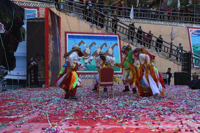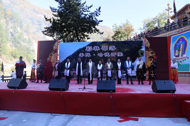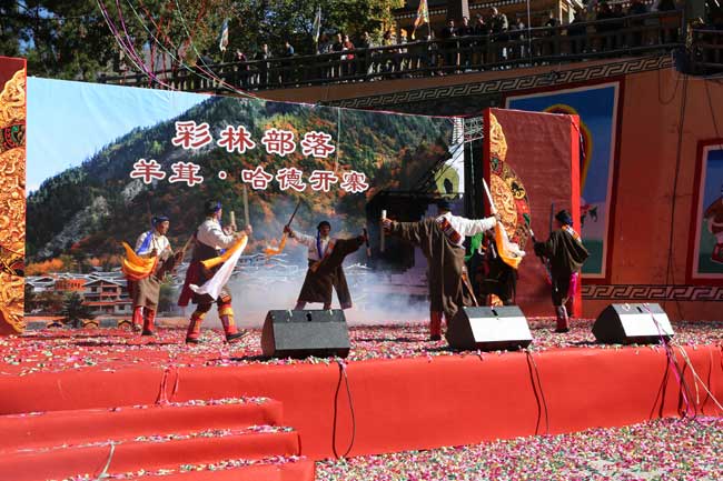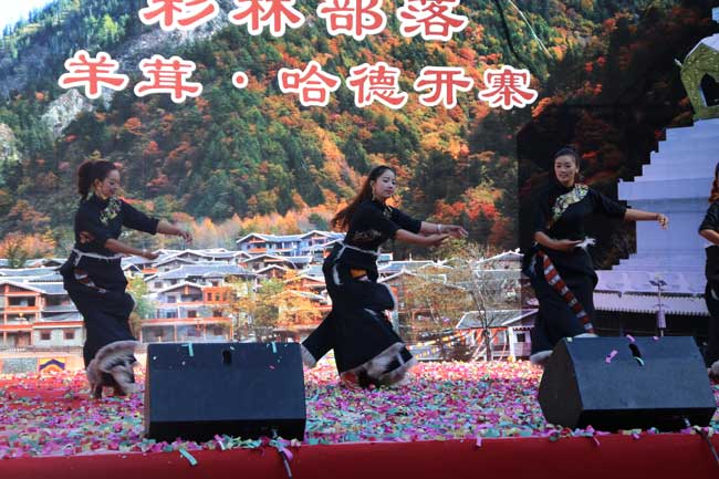 羊茸·哈德,碧水潺潺,林蔭繁茂,彩林環(huán)繞下的藏式碉樓,色調(diào)分明、鱗次櫛比……10月20日,距離達(dá)古冰山景區(qū)8公里左右的羊茸·哈德在熱烈的氣氛中迎來了開寨儀式,讓來訪嘉賓和游客在被彩林環(huán)繞中的藏寨中享受了一場豐富的本土文化盛宴。開寨儀式上,具有2000多年歷史的神秘古老的“亞格慶”歡迎儀式,格薩爾王大刀舞等具有濃郁民俗文化色彩的節(jié)目依次上演,同時(shí),蜂蜜制取、抓鳳尾雞撿生態(tài)蛋、制作藏家美食、著藏族服飾、騎馬、煨桑、跳鍋莊等活動也讓嘉賓和游客在身歷其境中體驗(yàn)藏家之樂。