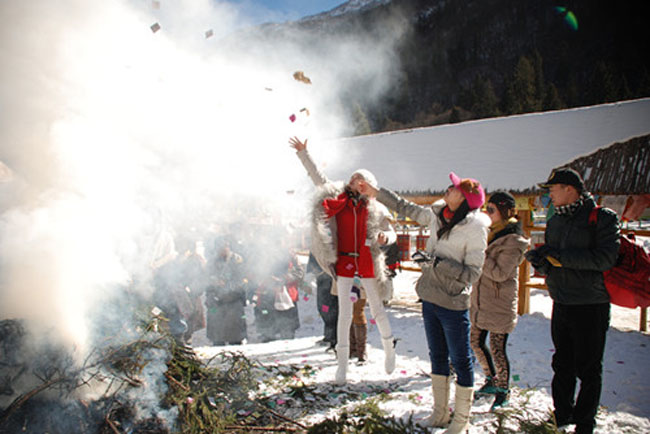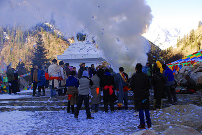 (當地藏民在圣山下進行煨桑迎新年)