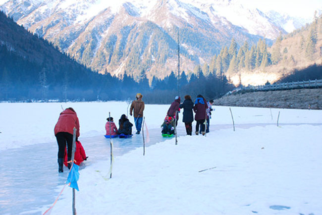 (游客朋友在冰凍的達古湖上嬉戲玩樂)
