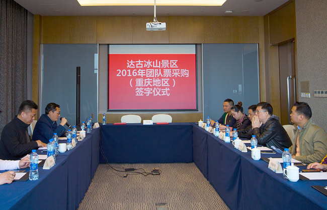 3月18日,應重慶市主要旅行商(社)聯合邀請,達古冰山景區管理局負責營銷宣傳工作的相關負責人和工作人員一行來到重慶市,就2016年達古冰山景區營銷宣傳、渠道建設、戰略合作等進行商討。會上,不但達成了達古冰山景區2016年旅行社合作協議,也簽訂了團隊票采購合同。