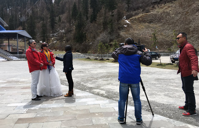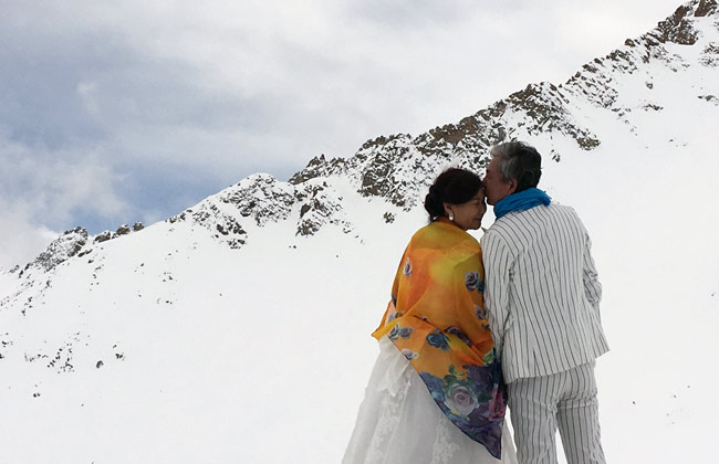 來自成都的張銀榮、王金凱夫婦今年剛好60歲,在接受電視臺記者采訪時表示:能在本命年登上海拔4860米的冰山之巔,拍攝婚紗照,真的很特別,也很激動。在幾對夫妻(情侶)中,有一對夫妻是來自若爾蓋的藏族朋友,他們是鄧秋和讓措,讓措女士告訴記者:“年輕的時候,條件不太好,沒有拍過婚紗照,今天是我第一次穿上婚紗,而且還能在這么美的地方拍照,真的很開心。”
