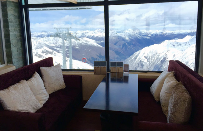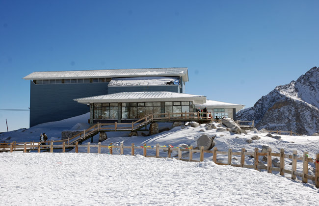 咖啡館設(shè)在冰山之巔索道中心的二樓,視野十分開闊,三面都可以欣賞到壯美的冰山景致,且每一面所看到的景致都不相同:可以看紅色的纜車在壯麗雄渾的雪山群背景下緩緩駛向山巔;可以數(shù)陽光下由遠(yuǎn)及近的雪山群峰到底會有多少座,多得真的數(shù)不過來;看游人在冰山之巔撒野,在雪峰下留下美麗的合影;夏天可以看到群山間綠如翡翠的海子……而咖啡館本身,坐落在圣潔壯美的冰山之巔,外觀十分唯美,除了沒有極光,一切風(fēng)光都可與北歐媲美。