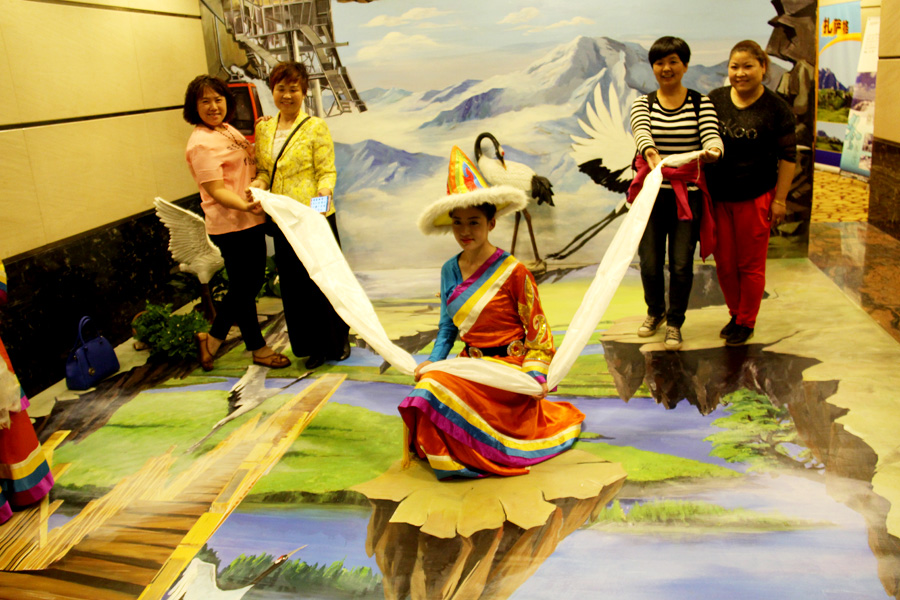 簽到展示區呈現的巨型手繪3D實景圖,匯集了若爾蓋、達古冰山等景區元素,3D的立體效果帶來強烈的視覺沖擊。整個墻繪立體感極強,畫面中騰飛的黑頸鶴更是呼之欲出。嘉賓站在立體畫的特定位置、按特定的角度做出一定的姿勢,拍出立體感極強的照片,體驗置身畫中的感覺。