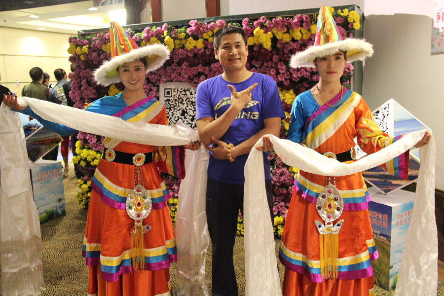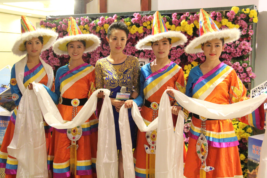 亮點二:草原創意花墻展示、藏族少女盛裝迎接,引現場嘉賓身臨其境。