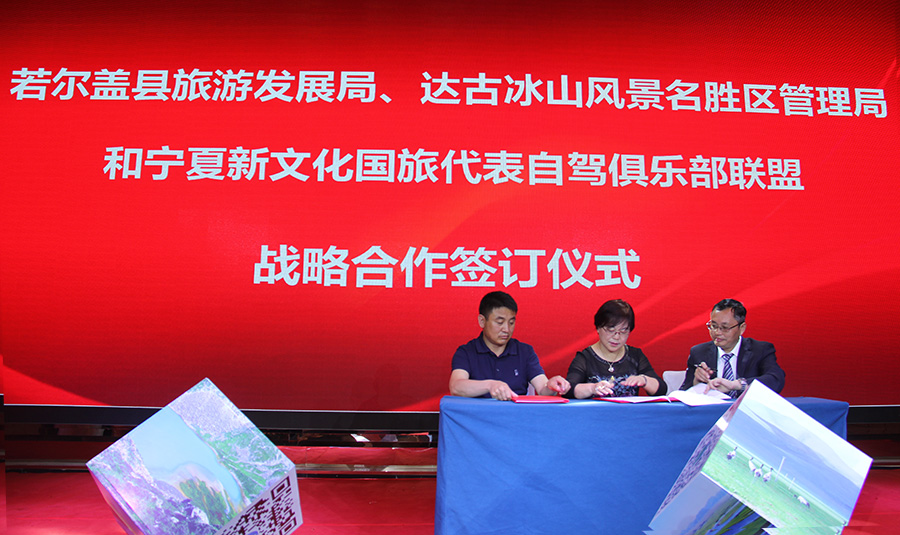 若爾蓋旅游發展局、達古冰山風景區管理局與寧夏新文化國旅代表自駕俱樂部聯盟簽訂戰略合作協議。)