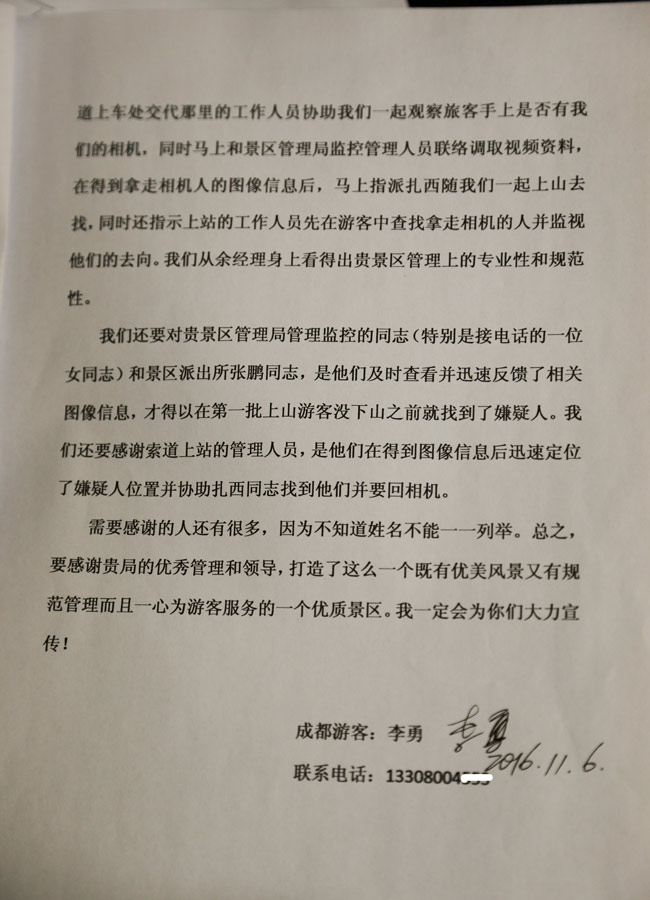 我們要特別感謝的是貴景區索道部管理人員扎西同志。發現相機遺失后,我們第一時間報告了正在索道下站入口處值班的工作人員扎西同志,他二話沒說立刻隨我們到了事發現場了解情況、查看周圍監控攝像頭位置并一直協助我們和管理監控攝像頭的管理局工作人員聯絡和派出所,然后又指示我們找到了索道部余經理報告情況,后又受余經理指派隨我們一同乘索道上到山頂找到拿走攝像頭的游客,直至拿回相機。整個過程他都熱情、耐心、周到,表現了良好的工作素質,給我們留下了很好的印象。