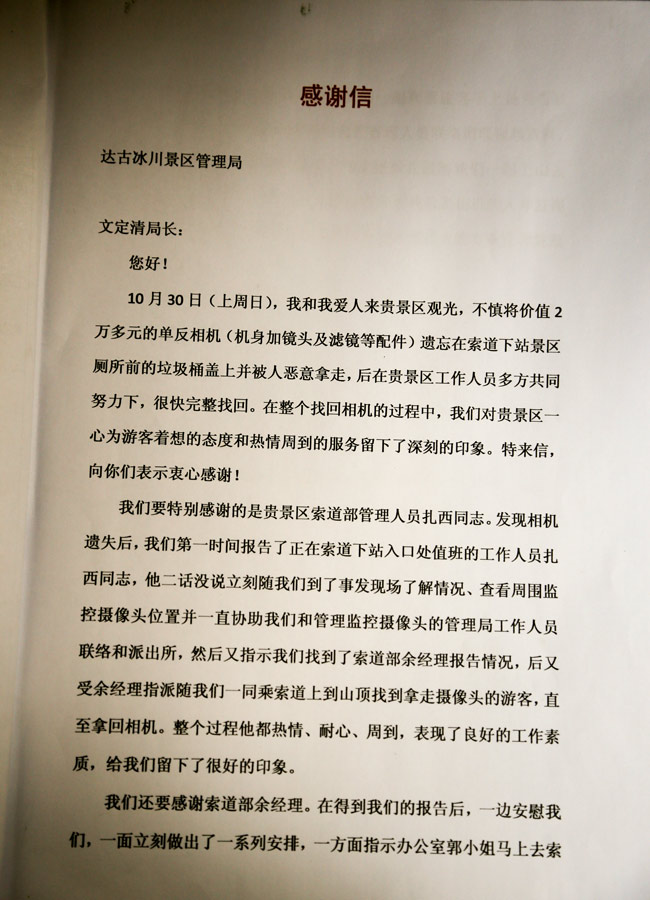 10月30日,成都游客李勇先生攜愛人暢游達古冰山景區。期間,不慎將價值2萬多元的單反相機(機身加鏡頭及濾鏡等配件)丟失并被他人拿走。事件發生后,在景區工作人員幫助下,其相機得以完璧歸趙。回成都后,李勇先生為管理局寫來了感謝信,其全文如下: