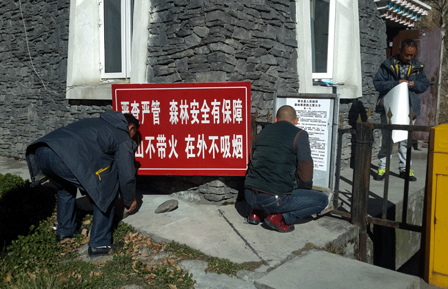 座談會結束后,工作組出動多臺宣傳車,在景區公路沿線、各村寨巷子反復播放《森林法》、《森林防火條例》、《森林火災案例》等相關法律法規知識,并向村民、游客散發了森林防火等各類安全宣傳資料,在人員密集的場所和游客上下車點增設了森林防火宣傳標語牌和“嚴禁吸煙”的森林防火警示牌,并隨處對景區村民及游客進行了森林防火知識的講解,使廣大景區群眾進一步增強了森林防火意識和法制意識。