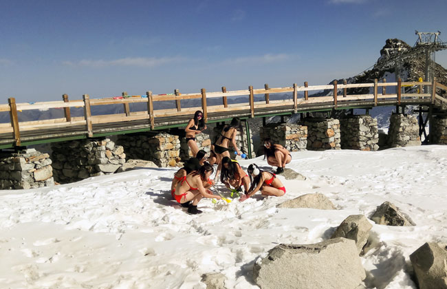 12月18日上午,在海拔4860米的達古冰山之巔,網紅身穿比基尼頂著刺骨寒風直播冰雪盛景,不同的角度,不同的冰雪。堆雪人、玩自拍,怎么瘋狂怎么來!與網紅近距離接觸,共同感受達古冰山冬日的魅力,成了當日景區(qū)游客最其妙的體驗。而通過直播軟件,全國各地的觀眾們也和主播美女度過一個不一樣的冰雪周末。