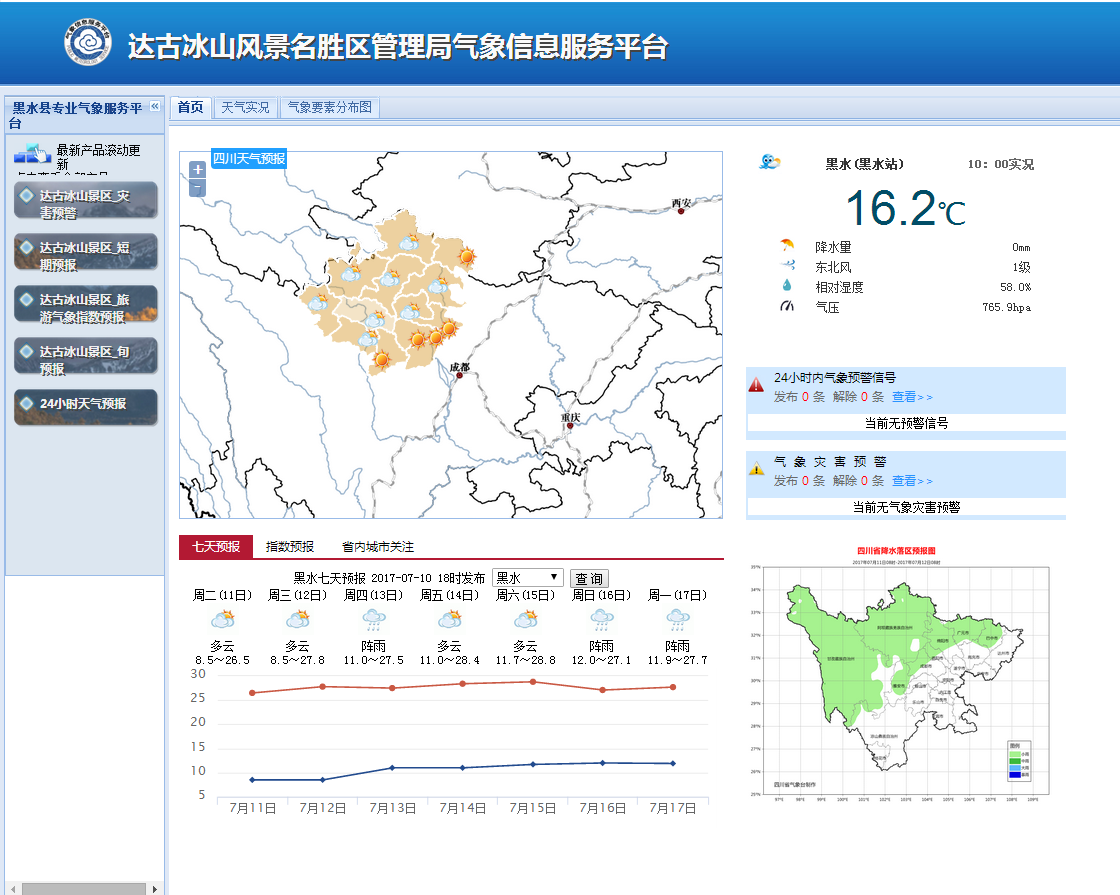據省、州氣象局,達古冰山氣象站預測:達古冰山7月11日,多云間晴天,6-27℃;7月12日,多云間晴天,7-28℃;7月13日,多云間晴天,6-27℃;7月14日,多云間晴天,5-27℃;7月15日,多云間晴天,6-27℃;7月16日,多云間晴天,6-27℃;7月17日,小雨間晴,6-28℃;7月18日,小雨間晴,6-29℃;7月19日,小雨多云,6-27℃;7月20日,多云間晴,6-27℃。除開在烈日下爆嗮溫度能達到25℃-28℃,其余地方皆在20℃以下。