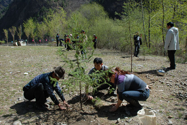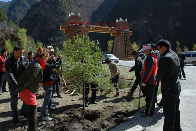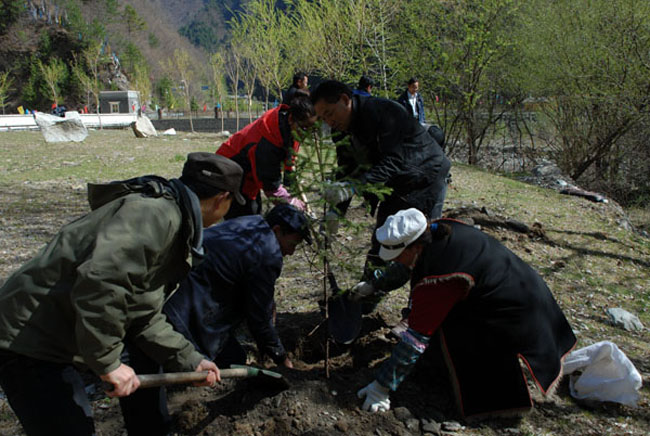 ? ? ? ??達古冰川景區是阿壩州二次旅游創業重點打造的景區之一,為不斷提升形象,努力把景區打造成為全國最佳旅游目的地,達古冰川管理局將2012定位為““形象提升年”。按照“形象提升年”規劃和要求,要大力提高景區游客中心森林植被覆蓋率,實現游客“走進達古冰川就走進森林,游在畫中”目標。今天,在管理局游客中心植樹現場可謂是熱火朝天,挖坑、種樹、填土、澆水各司其職,有條不紊。熱火朝天植樹現場還吸引了到景區旅游的游客,有來自大邑縣的7位游客旅游出溝后主動參與其中,親手揮鋤栽下一棵樹以做紀念。據統計,今天,管理局繼3月26日種200余株樹后今天再次種植杉樹200余株。