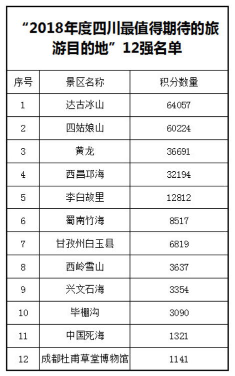 12月11日晚,由四川省旅行社協會、四川研學旅游聯盟主辦的“2018年度四川最值得期待的旅游目的地”網絡投票活動落幕。在10天的激烈角逐中,有超過20萬人次為心儀的景點投出了寶貴的一票,12個川內旅游景點當選“2018年度四川最值得期待的旅游目的地”,其中,達古冰山風景區以總積分64057分榮登榜首。