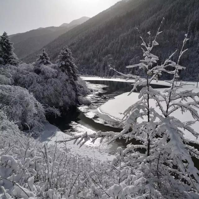 這是今早達古的最新雪景,樹木、群山、河道、湖泊,堆滿了雪,春雪降臨,達古冰山煥然一新。