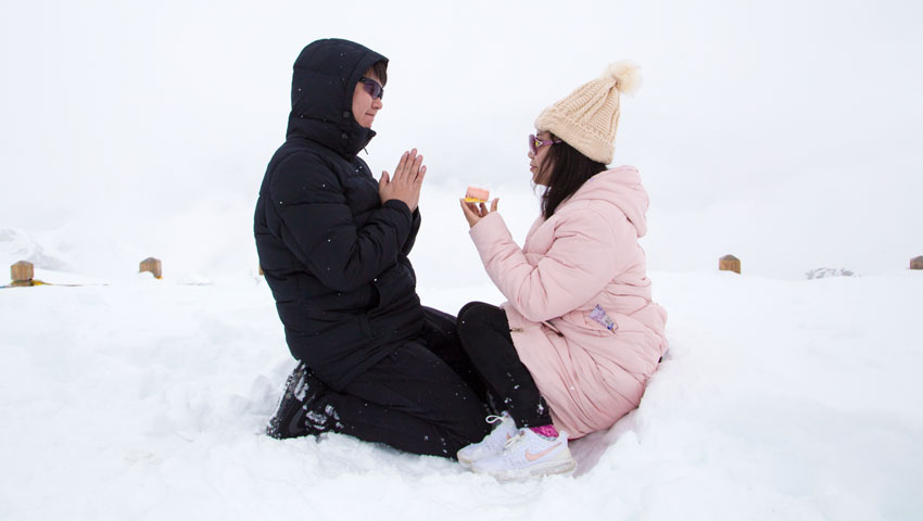 他們背靠群山,面朝淚湖,甜蜜的小兩口許下了屬于自己的山盟海誓。事后男子透露,希望兩人就像這雪山與淚湖永不分離,愿世界和平共生。