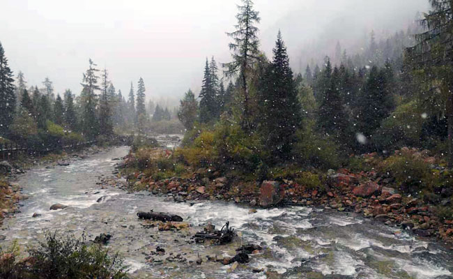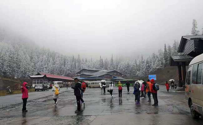 10月1日,國慶小長假第一天,達古冰山景區(qū)天降瑞雪喜迎華誕,整個景區(qū)瞬間一片銀裝素裹。