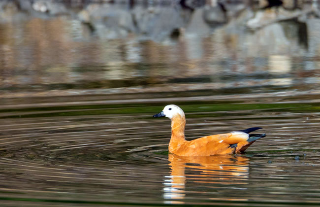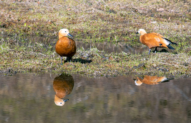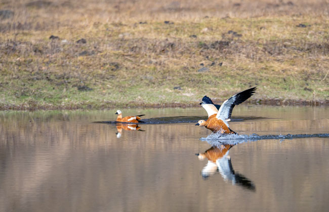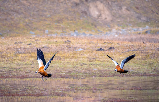赤麻鴨(學名:Tadorna ferruginea)體型較大,體長51-68厘米,體重約1.5kg,比家鴨稍大。全身赤黃褐色,翅上有明顯的白色翅斑和銅綠色翼鏡;嘴、腳、尾黑色;雄鳥有一黑色頸環(huán)。飛翔時黑色的飛羽、尾、嘴和腳、黃褐色的體羽和白色的翼上和翼下覆羽形成鮮明的對照。棲息于開闊草原、湖泊、農田等環(huán)境中。