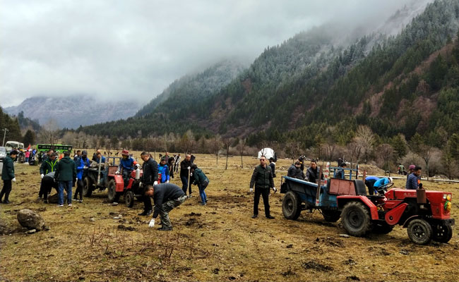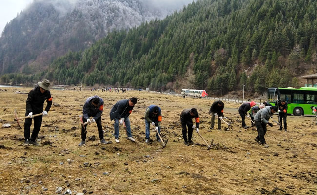 二是全員參與,投工投勞。4月3日、4月10日管理局組織全體職工、景區管護人員、環衛工和大冰川公司全體員工一道在金猴海花海規劃區進行義務投工投勞,通過機械培土、人工清場、旋耕作業等方式全面完成種植綠化、美化,提升景點品質的任務。