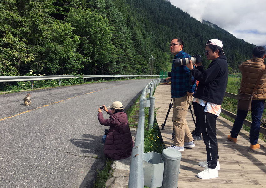 剛剛進入景區(qū),一群熱情好客的藏酋猴就迎了上來。面對大咖們的長槍短炮,它們一點都不“怯場”,反而鏡頭感滿滿的擺起了各種pose,逗得大家哈哈大笑。
