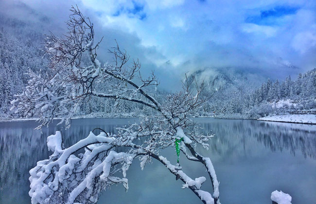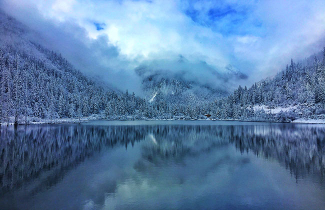 達(dá)古的湖泊在冬季,不只是擁有碧綠如寶石的湖水,還擁有超美的雪山倒影。圣潔的雪山,在遠(yuǎn)處靜靜地守護(hù)著達(dá)古,倒映在達(dá)古的湖泊里。周圍的山林也被白雪覆蓋,綠色的湖水被白色浸染,仿佛綠色紙上的白墨畫。
