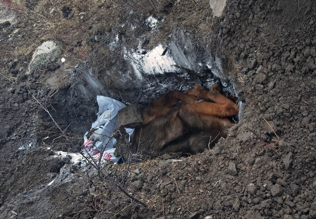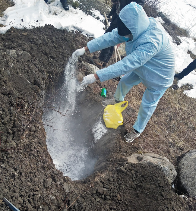 工作組一行通過現場勘察后發現,死亡的野生動物系國家二級保護動物鬣羚,俗稱“山鹿”,根據棱角初步判斷其年歲較長,加之其全身無傷痕、無血跡,無病狀表現,認定其死亡屬自然老死,不是動物疾病死亡。經工作組研究后決定對鬣羚的尸體進行了無公害深埋式處理,并噴灑了石灰、溴氯海因粉、戊二醛癸甲溴銨溶液。
