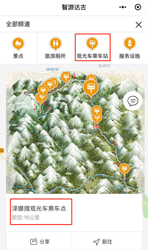 點(diǎn)擊觀光車乘車點(diǎn)就能看到各乘車點(diǎn)的景點(diǎn)是什么以及離自己最近的乘車點(diǎn)是哪一個。