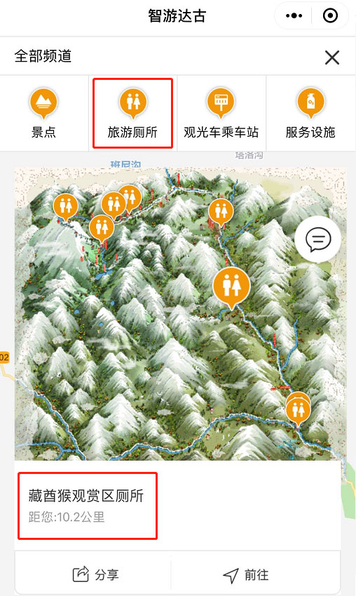 點(diǎn)擊旅游廁所就能夠出現(xiàn)景區(qū)旅游廁所的分布點(diǎn)位,也可以很方便地找到離自己最近的廁所的位置。