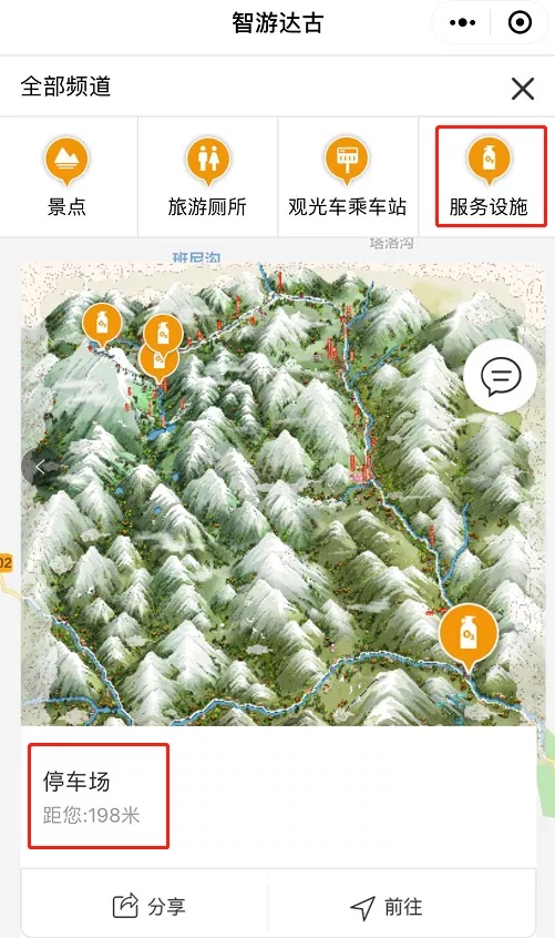 點(diǎn)擊服務(wù)設(shè)施就能看到里面包括游客服務(wù)中心,索道上下站,停車場等服務(wù)設(shè)施,也能清楚地看到自己所在位置與某一個點(diǎn)位的距離。