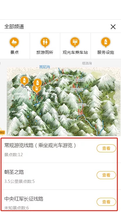 在全部頻道里,點(diǎn)擊景點(diǎn)板塊,然后點(diǎn)擊圖上任意小圖標(biāo)就會出現(xiàn)該景點(diǎn)的名字,點(diǎn)擊名字就會看到該景點(diǎn)詳細(xì)的圖文介紹。
