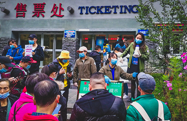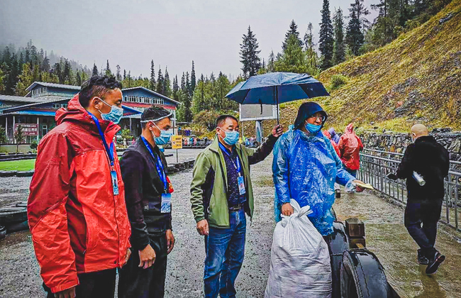 國慶節(jié)期間,冰川義警及景區(qū)工作人員始終堅(jiān)守景區(qū)一線,他們熱情大方、耐心細(xì)致,不厭其煩為游客提供景點(diǎn)講解、咨詢服務(wù)、游客指引、投訴受理等服務(wù)。面對(duì)“旅游接待要順暢,疫情防控不能松”的雙重考驗(yàn),景區(qū)工作人員還地變身“防疫員”,在做好防疫宣傳的同時(shí),進(jìn)一步強(qiáng)化疫情防控動(dòng)態(tài)巡查,及時(shí)發(fā)現(xiàn)勸誡和制止不配合體溫檢測(cè)、隨意摘除口罩、隨地吐痰、聚集扎推游覽等不配合疫情防控要求和不文明旅游行為,確保“十·一”黃金周和冰川彩林黃金季期間的疫情防控工作萬無一失。