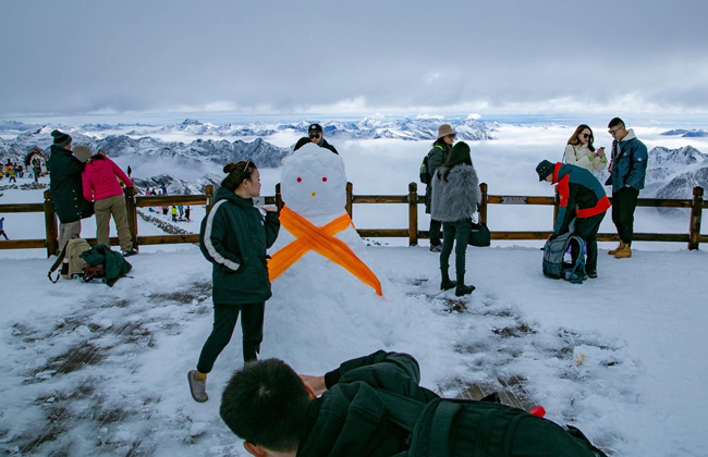 一到十月份,達古冰川的無限魅力就再也隱藏不住了,縹緲的云海、壯闊的高山、綿軟的白雪形成一幅人人見而贊嘆的壯麗風景,置身其中,仿佛化身童話世界的小精靈,與雪花一起在雪地中翩翩起舞。堆可愛乖萌的小雪人,在觀景臺的雪地中滑著雪,自由肆意地歡笑著。