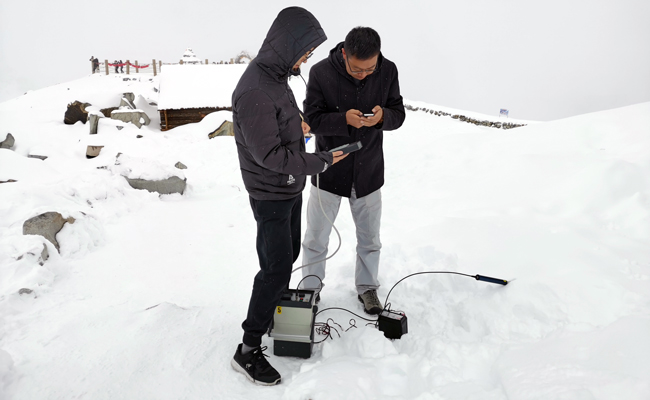 會后,中國科學院西北生態環境資源研究院王世金研究員一行10余人對達古冰川進行了常規觀測和調研。觀測人員在冰川末端選取了10個觀測點,利用雪特性儀和測溫槍等儀器,以10cm為間隔,對積雪密度、積雪厚度、積雪溫度、含水率等進行了監測。同時,采集了積雪樣品,擬對積雪粉塵微粒、化學元素、有機物等環境要素進行分析。