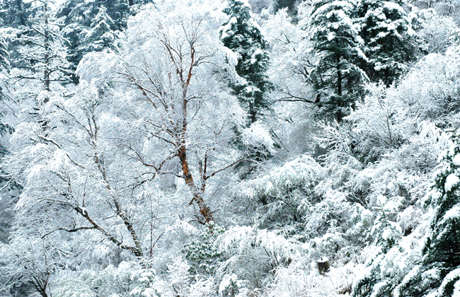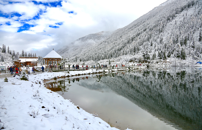 寧靜的湖面上,倒映出冰雪林木的素凈和美麗。大自然就像一位神奇的畫家,用白色顏料在墨色的湖面上盡情揮灑。這里也是藏酋猴們的“游樂園”,小家伙們精靈又活潑,近距離跟它們接觸拍照,萌翻你的少女心。