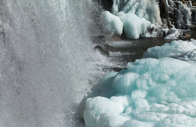 夏日里流動的澤娜措,在被冬日像被施了魔法一般,瀑布凝固成一條條倒掛的晶瑩冰柱。仿佛來到了仙境一般。