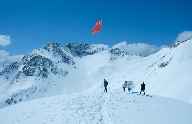 山頂上遠遠望去,這抹獨特的紅格外耀眼,五星紅旗飄揚在雪山之巔,來張合影,超有紀念意義的。