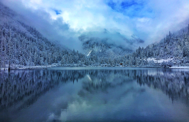 白雪冰枝,高山雪峰悉數倒映在達古湖中,簡直就是一個雅致寧靜的仙境之地。冬季,漫步在情人灘上,周圍滿滿的浪漫氣息,雪后的山林和湖泊,在白霧的包裹下,神秘而誘人。