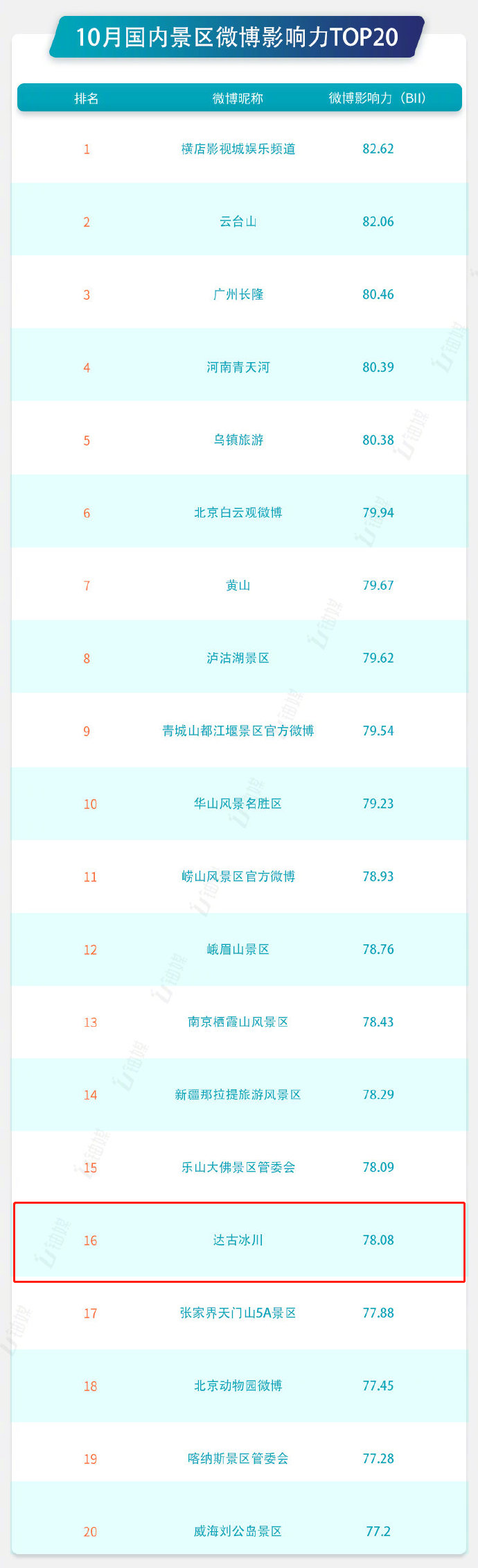 10月迎來了國慶中秋雙節,也迎來了期待已久的八天長假。據統計,國慶期間前7天超過6億人次出游,選擇在國內迷人的秋色中釋放短暫的步伐。同期,新浪旅游官方發起#這個秋天這么玩#話題活動,一同記錄宜人秋色,領略絕美秋季。@新浪旅游聯合@鈾媒及@微熱點共同發布10月旅游出行榜單及數據解讀(榜單由上海交大大數據與傳播創新實驗室提供算法及學術支持,從賬號的累計指數、發布指數、互動指數、活躍指數等維度綜合評估微博影響力),其中10月國內景區微博影響力TOP20,達古冰川榜上有名,也是阿壩州唯一一個上榜景區!!