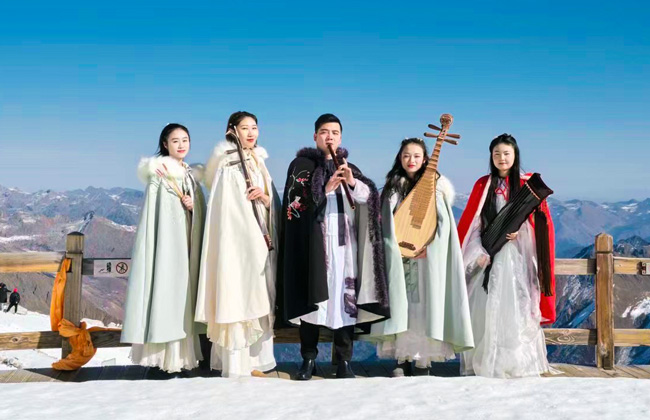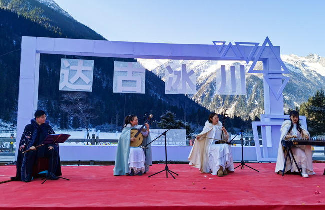 開幕式上民族歌舞熱鬧喧天,節日氣氛濃烈,身著特色民族服裝的表演人員為我們演奏一首又一首經典樂曲,古箏、二胡、笛蕭、大鼓、揚琴、琵琶,在他們的彈奏下譜出聲聲動聽的旋律,或柔和優美或慷慨激昂,陣陣動聽悅耳又充滿異域風情的音樂聲穿梭在冰川雪峰之中,余音繞梁,吸引了不少游客駐足欣賞。絕美風景遇上高雅音樂,給現場的游客們帶來了別樣的視聽享受。