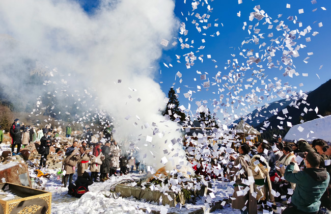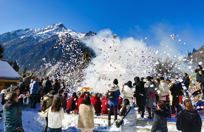 音樂會過后,游客朋友和本地藏族同胞一同參加了洛格斯新年祈福,“洛格斯神山”,漢語譯為“群山守護神”,是當地藏族同胞心目中的神山。大家齊聚在此,在洛格斯神山的白塔前,一起拋灑龍達、在神山腳下許下新年愿望,祈求新一年的好運勢。這一充滿儀式感的活動承載著大家新一年的美好希冀,不但讓現場不少朋友感受到了藏區宗教文化的神圣,也體驗到景區洛格斯神山的神秘和神奇。